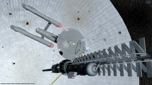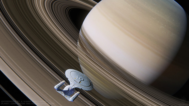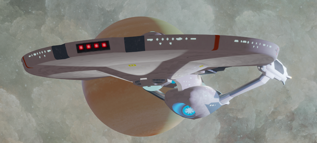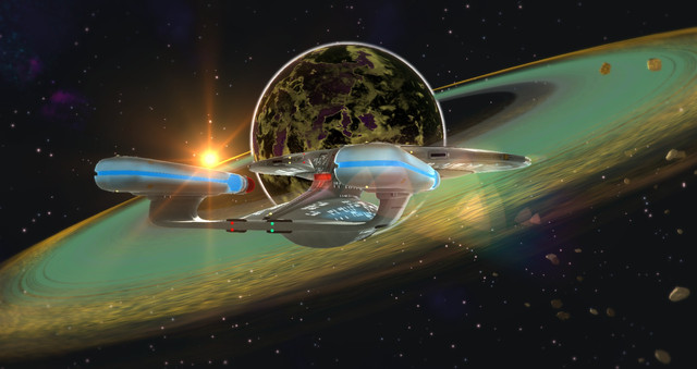 The central theme of "Star Trek" (TM) that has always attracted me to the shows is exploring the unknown; going where no one has gone before. Here, the U.S.S. Farragut (a Nebula-class ship, a long-time favorite of mine) begins the careful survey of a newly discovered solar system with a pass of the largest planet, a super-Jovan with a vast ring system. The nightside glows, not just with reflected ringlight, but by the warmth of the planet's own internally generated heat.The scene was set up and rendered in Lightwave 8.5. The impressive Farragut model and textures were provided by an uncredited artist at the Lightwave Group v3 website. The ringed planet is based on a Lightwave freebie Nick Stevens offers on his always interesting [link] website. The color maps for the giant are partially based on Jupiter maps by NASA/JPL/Space Science Institute.