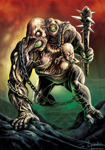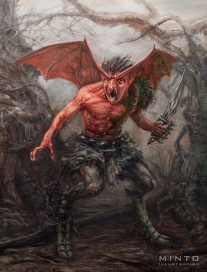 I really like how this came out, it has good atmosphere, good color use... but the best part really is the creature himself. They both look so demonic especially with the idea that he is literally caged in his chest. That's a unique twist that I very much appreciate. Great job with the creature's anatomy and muscle structure!