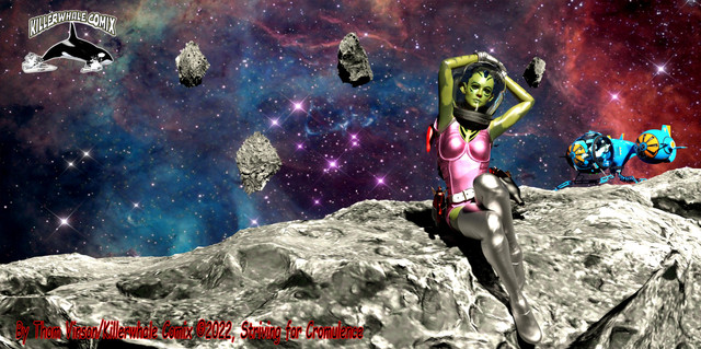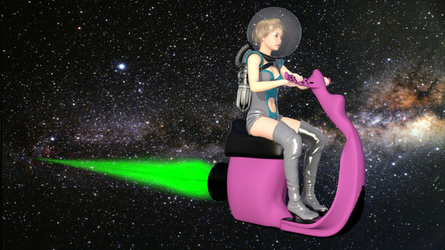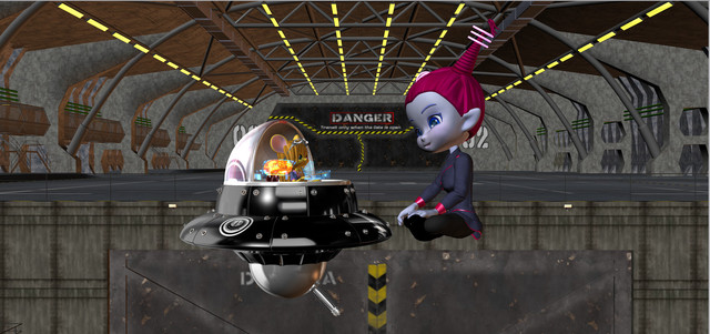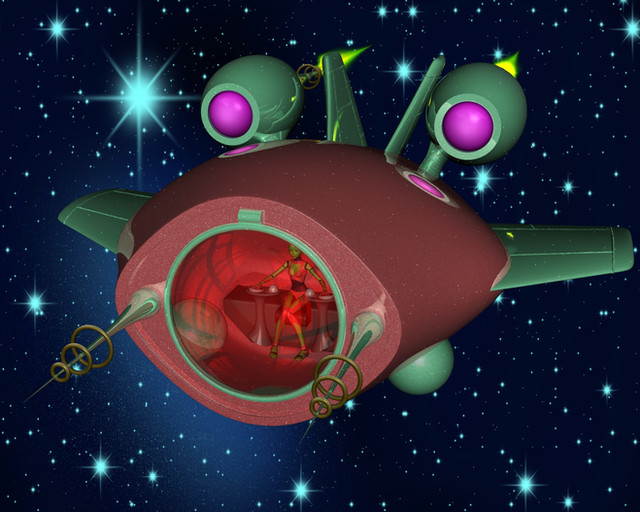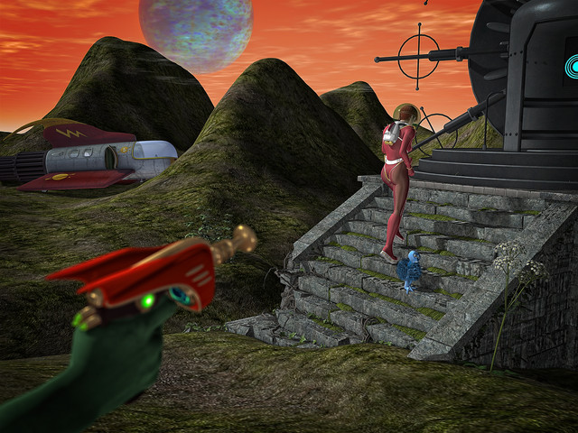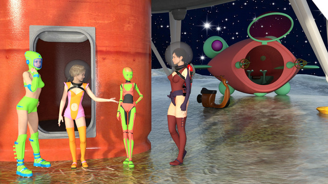Arriving at the Fortress of the Space Amazon Queen, Robogirl disembarks her Atomic Rocketship.You can see just how perfectly cheesy this prop is from this angle, it looks like something poorly made of fiberglass for a low budget movie, which is exactly what it is supposed to look like!