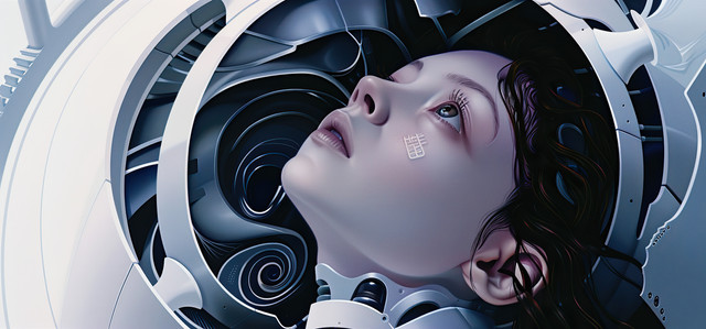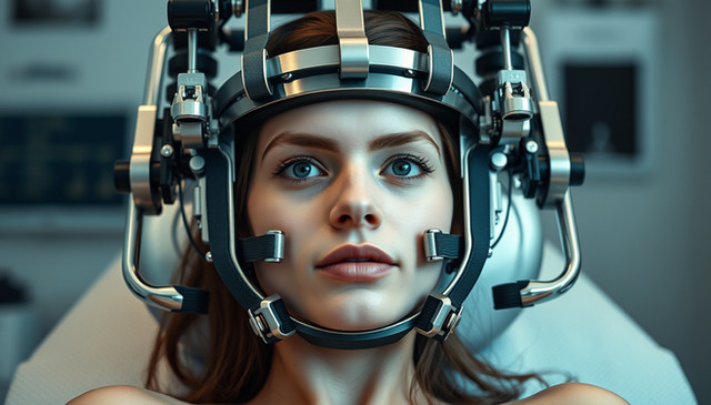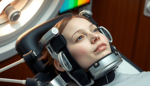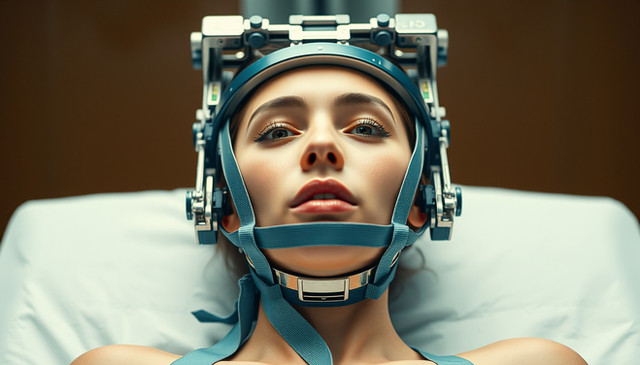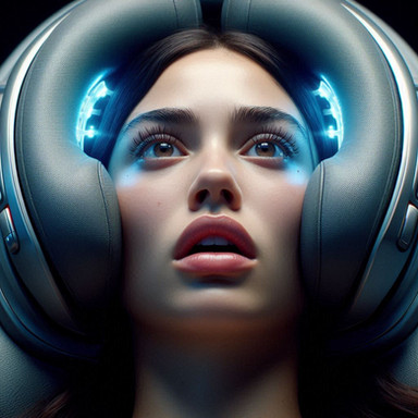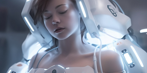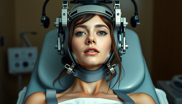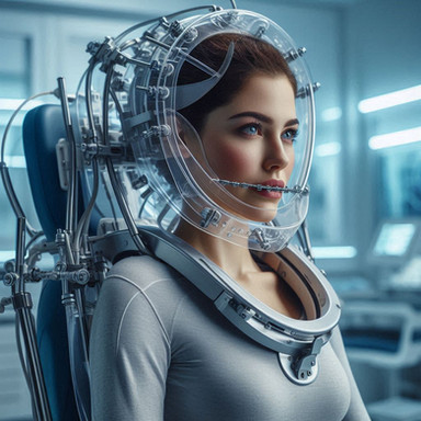 Prompt: a realistic render of a young woman in a futuristic medical chair, scifi