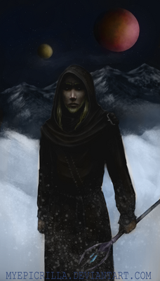 Another Dragonlance fan art, this time the mage Raistlin Majere.Behind him in the night sky are the three moons of Krynn, representing the three schools of magic. The right one is called Nuitari and can only be seen by black mages, which is why it's half transparent and barely recognizable.