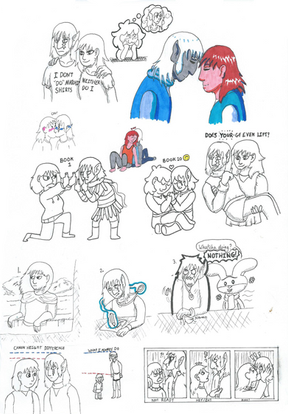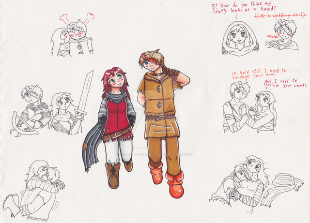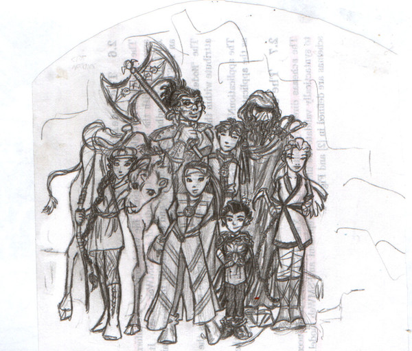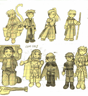Heh, this is one of the most entertaining DnD parties I've ever been in-- I have some other pics of some of these characters about. ; DThis was my theory as to how things would be at the end of the campaign after we saved the world from an avatar of Tiamat and all that good stuff. Basically that our party would be pairing off and their respective deities (which occasionally chose us or took a direct hand in prodding us along our quests as we neared those epic levels) would react accordingly. Bahamut and Corellon seem fairly pleased, Mask is....perhaps less so as both of the characters he's taken interest in are pairing off with goody-goodies. ^_^;