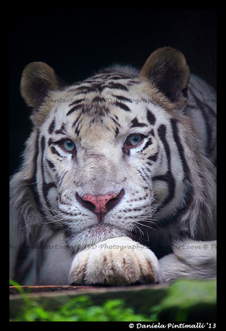 Beautiful white tiger; it's pose is reminiscent of a geisha, all right.