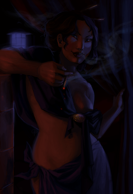 You've made a lovely use of warm and cool hues for the wrap she's wearing around her hips, and you've got that lit pretty well in terms of the effects of candlelight. On her skin though, you've gone much more delicately with the blue, and this keeps her tone very warm all over, which would probably not be the case in a cave like setting with only a few candles for lighting.