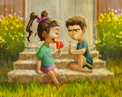 I like the expressions and the highlights in the hair are nice. Also, the background is neat.