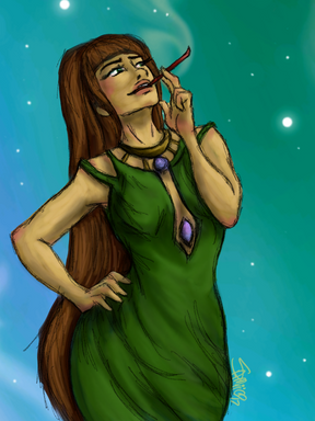 Amelia Aarons (from my illustrated webnovel, Thorns [link] ) smoking on the Rara Avis. If her head looks ginormous, it's because it is; big hair is all the rage in Anaxas.I painted this while listening to the entire recording of Evita twice in a row. (The Madonna version, not the Broadway cast.) Mmmm.