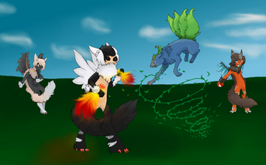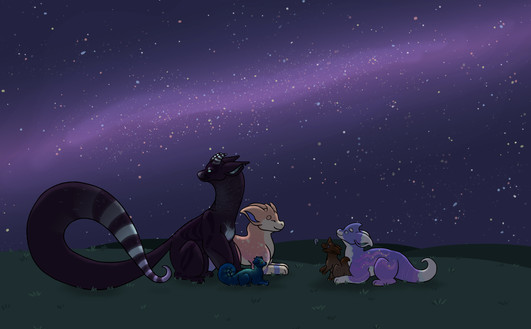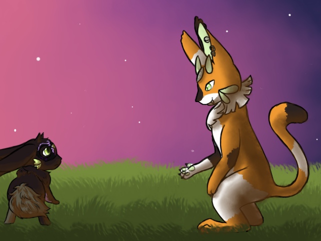 The grass behind Koneko rustled with the footfall of somebody approaching from behind. The nyulop quickly turned to see who it was, and found herself looking up at one of the adults towering (in her eyes) above her. Koneko backed away, fur bristling in fear, as she watched the adult nyulop lower herself and extend a paw in an amicable manner. The child tried to remember who this adult was. They seemed familiar... The setting sun's light glinted off of a coin on the adult's forehead, and the realization struck Koneko: This was Silver. She hadn't spoken to her, but she recognized her from the town and what she's heard other children say.
