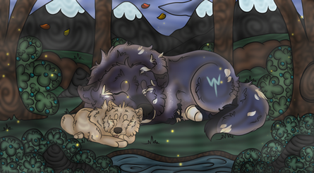 Under the mistletoe...v u vMy christmas present for my mother! A napping mother with her pup rest beneath the trees. Mistletoe hangs above them, and the pup licks her mother affectionately. Contentment is for sharing each other's company.