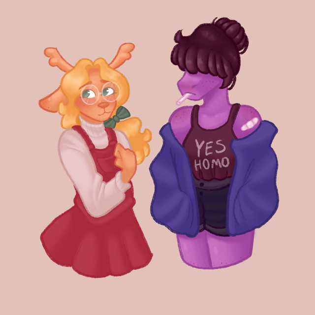 i draw suselle way too little considering how much life it gives me so here's noelle gay panicing over susie at a party? prom?? h???i made their hair short because uhhhhh i'm into short haired girls ok leave me alone D,: idk why susie is wearing a dress she'd be much cuter in a tux but-