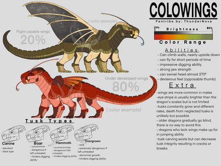Desolate is a Rain/Sandwing hybrid. Despite her being half Rainwing she prefers to be referred to as a Sandwing since she mostly looks like one and blends well. She's unable to camo but she has the same tail and "magical death spit" as a rainwing along with a rainwing head, everything else is sandwing-ish. She's like tall and really masculine, she's stubborn and rude a lot. So now to her backstory basically she was just a normal hybrid living a normal life but then she met a seawing animus who she became close friends with. One day she managed to convince said seawing to enchant her wings to have the ability to turn any dragon to stone if one were to look at the eyes. She shortly after betrayed the animus and turned them to stone, she now resides in the scorpion den where said seawing now a statue sits outside her house. She works for a Skywing by the name Carbine who resides in possibility. Carbine is a runaway Skywing princess who saw value in Desolate's power and took her in. Carbine made especially sure that her name and identity was completely erased from the Skywing's history. The two now work together and their goal is to overthrow the scorpion den, forcing them to be loyal to the two.fdhksjfhdsk I know this is a mess but im not good at backstories and stuff but yeah this is her.