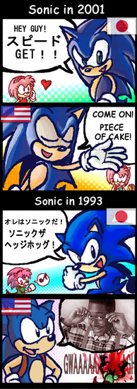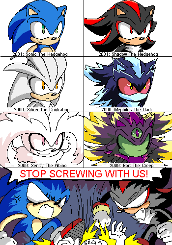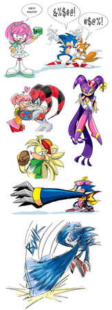 Sonic's biggest threat is his own fandom.I dug up an old fan character from out of the 90s named Ax for the main hog. He didn't do much, except show up in this here comic strip slightly modified and mocking his own existance, that is, fandom in general. Cheers, snitches.