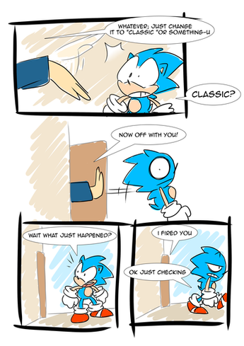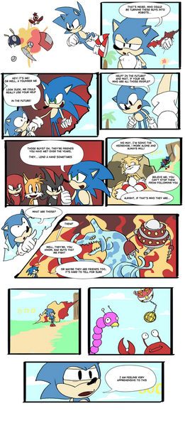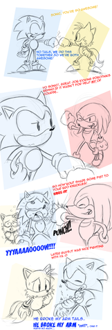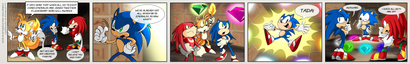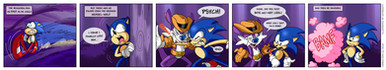 Ah man, that was a surprising attack. Blaze also has some pretty crazy moves. And that Saiyan-esque thing at the end? What's with that, anyway? Ah well, still my favorite part of that battle. Very nice, Sonic's expression in the fourth panel is too great.