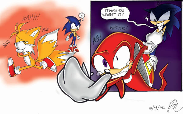 Afterwards Sonic, Knuckles, and Tail lie beaten to the ground, with holding the mace in his hand