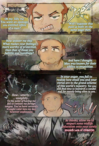I just read the whole thing, and it's brilliant! I especially like all of the dramatic illustration effects you used, like the ones in the battle scene for example. I think the shading is excellent, too. But most importantly...
