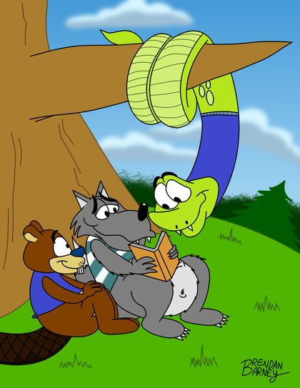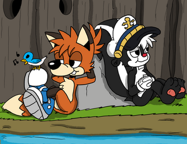 Redraw of:J.Q., R.P., and Pedro rest up by Pete's Creek in the middle of Mutton's Forest...and they're not alone. Could it be the fabled Pete the Poorly-Drawn Porcupine?