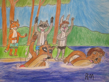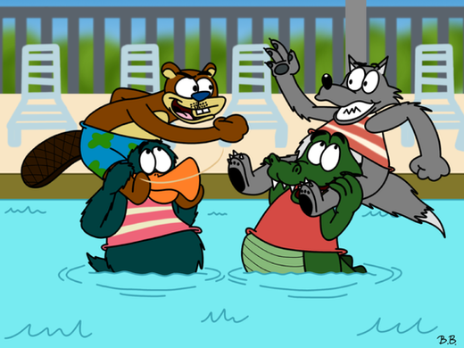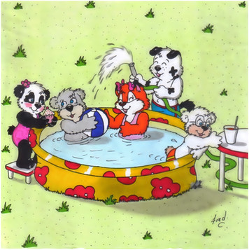 Whoops! It's summer time so that means fun pool times, with the kiddos. Wilbur and Murry may be a bit to old/big to play chicken against Pipper and Greggy. At least Shirley is enjoying their antics. Watch those hands, Zoey!---------------