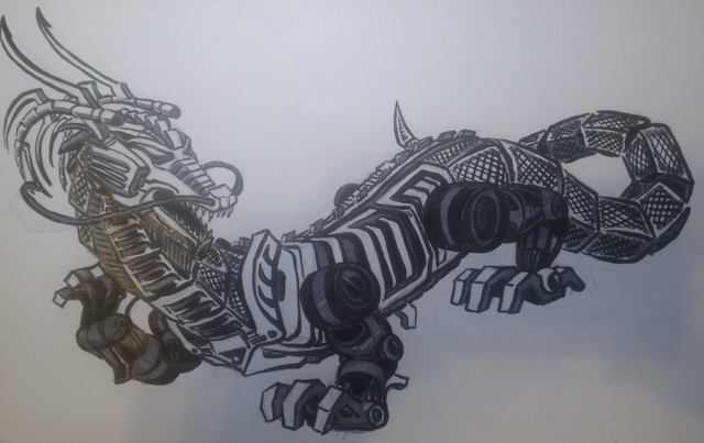 Here is the Sentinal Dragon colored. A mix of strange Sci-Fi and fantasy mixed in. A vicous form for robotic kind.This has been turned into an NFT. Which can be found here: