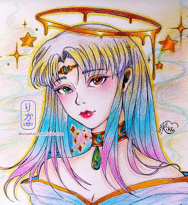 I love the shading on this because it is really soft and delicate and gives off an innocent, young feeling. The color choice for the two sisters is lovely as well because you nailed their personalities in fashion so well: Freya likes the darker colors, Chi tends toward the lighter ones. Freya's expression is very lovely too as it accents her personality very well, I just love how she is looking rather hesitantly at the viewer, while Chi has her usual innocent curious expression on. XD I wish Freya hadn't died, that really didn't seem very fair to her. Anywho, great job!