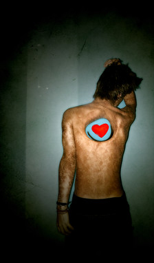 and theres an image of a man with his back to the camera and a hole in his back with a bit of paper showing through the whole with the word paperback written on it.
