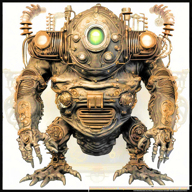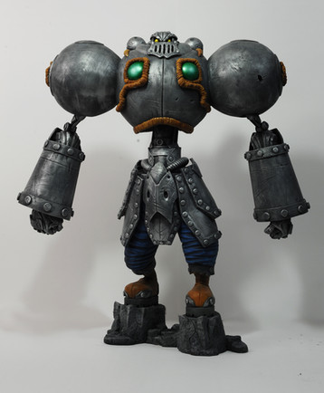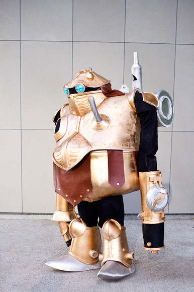 This is an amazing piece of work! The attention to detail and rusty/bronze look to it really adds to it's motif and authentic steampunkiness (that isnt a word, but im totally going for it!) I am just completely blown away by the small details; from the rivets to the amazing logo on his chest. Looks like you put a mess of time and love into him and I think it definitely paid off!