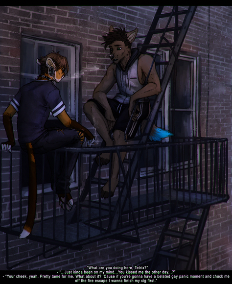 “What?” Kato kept his voice quiet, but it was patently harsh. After an irritated glance towards Athena’s sleeping form, he looked back up to Anarchy and jerked his head out the window before climbing out onto the fire escape. Anarchy hesitated for only a second, then padded quietly past Athena’s bed and, too, hoisted himself out into the mild morning air. Kato wordlessly shut the window in his wake before standing up and giving Anarchy a long, silent look.