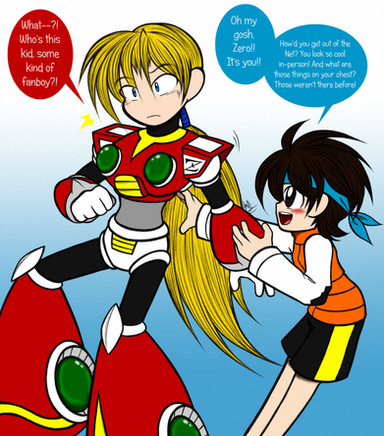 I've noticed there seems to be some sort of general conception amongst Zero fangirls that he has this nicely groomed head of long, flowing locks. But when you consider his line of work. . . not to mention just how damn frizzy his hair looks. . . does he REALLY put that much attention into grooming his mane? I mean, looking at that thing, he's got to have tangles and split ends up the wazoo, and the sheer amount of hair he'd have to groom would make it a total pain in the ass to keep it so nice looking, so my verdict? Zero doesn't do SQUAT with his hair in 21XX aside from probably wash it every once in a while. (22XX Zero on the other hand. . .)Related content