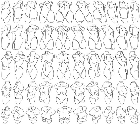 Sketch in the general shapes of the different sets of muscles. Check your muscle layout with an anatomy chart or constructive anatomy book. Number 1 marks the top of the iliac crest, where the pelvis protrudes a bit. Number two marks where the meat of the leg bends. Here is a very important item: breasts come in a variety of sizes and shapes, and they are chiefly comprised of fatty tissue. Breasts will look different depending on whether the figure is clothed or nude. Breasts react to compression, and they are affected by gravity.