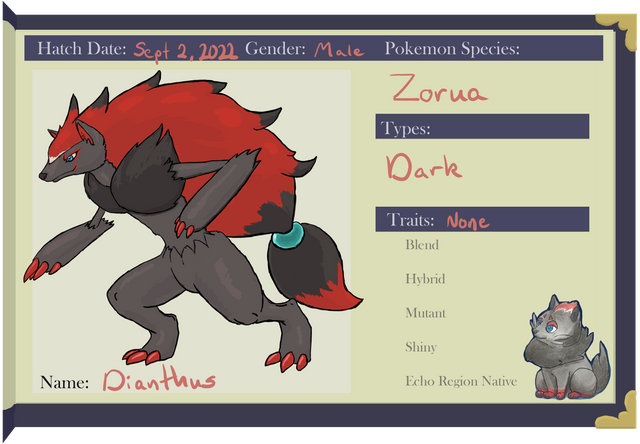 Such a fierce boy! But before he can evolve fully, you must have a separate piece showing your pupper at its final evolution, and not just as the ID for their app. I'll take this out until said picture has been made~