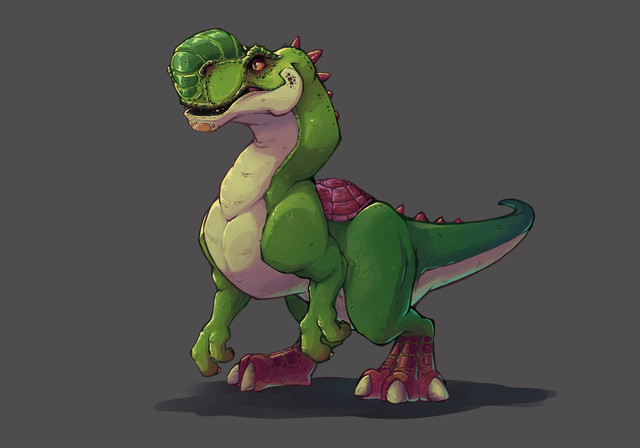 Y. munchikoopas. A medium-sized theropod dinosaur that originated from a small island in the southern regions of the Mushroom World. With a long sticky tongue and powerful jaws, it lives a life of an omnivore, capable of eating nearly anything it considers food.