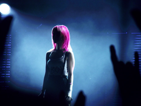 It captures the energy and enthusiasm of Hayley Williams' live performance almost perfectly by catching her mid-headbang. Whilst the feeling of movement is shown particularly well by the singer's slightly blurred hair, the rest of her face an body are pretty much spot-on in terms of focus which gives the level of details which is often difficult to achieve with live music photography. This is down to the photographer's obvious skill and experience. This is also show by photographer's positioning - being at the right place at the right time is key here.