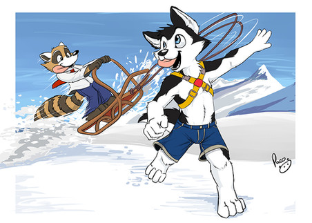 A german shepherd and a shiba inu ice skating. Well, one of them is skating. Good thing his tail broke the fall.This was my submission to Midwest FurFest 2014 con book. I hope they end up using it.