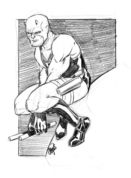 Your Dare Devil series is just great. Love the sharp dynamic lines and the blunt red shadows against the paper white highlights. It almost looks like the character will come to live and start jumping around the drawing frame!