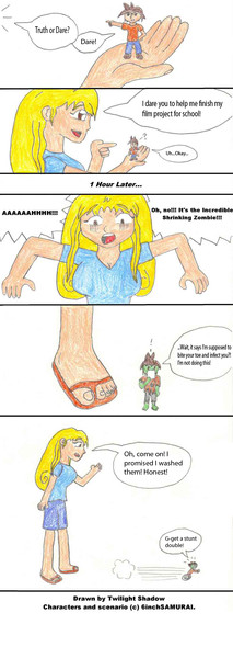 Dr. N. Gin builds lots of mechs, but here we find that he made a shrink ray (mostly out of boredom) And we see a gag that was once on an episode of Spongebob (Mermaid man and Barnackle boy 4 to be exact) which also happens to be this comics inspiration. But N. Gin's shrink ray has a flaw, after a certain ammount of time, instead of being 1/10th of your size you become 10/1 your size.Characters:
