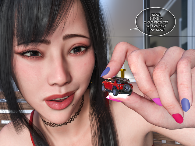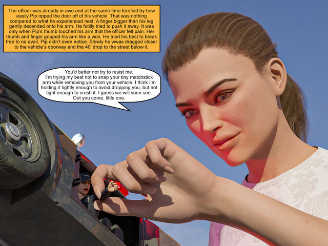 She could crush the truck with its passangers easily by her slight finger pressure. An insignificant movemet of her index finger and the 4 tinies on the open plateou of the truck are gone