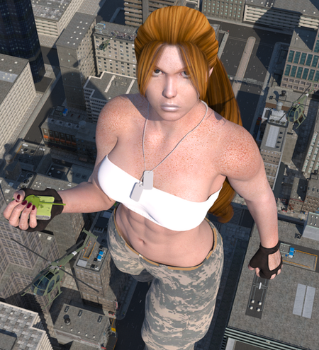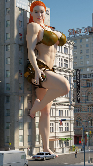Just an awesome job on this my friend,love the scale and how she's leaning against the building,her pov and shadows are fantastic.But what is that foolish little man doing so close to her,lol......could be trouble.