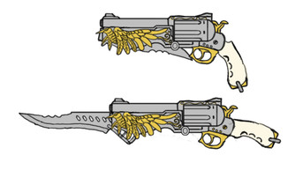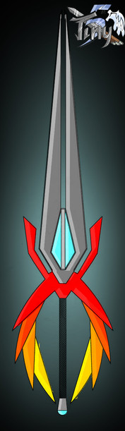 ordinary hand-and-a-half twin edged sword with flame motif on hilt, able to take on different forms and two armatures within the hilt are able to unfold, engulfing the blade in fire