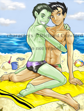 Beast boy is taking Cody for walk on his flip flop, Cody is holding onto Garfields big toe its more fun that way there is a slight smell but Cody is ok with itPicture drawn by