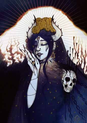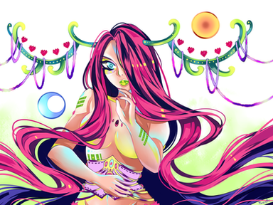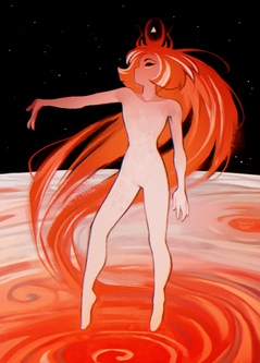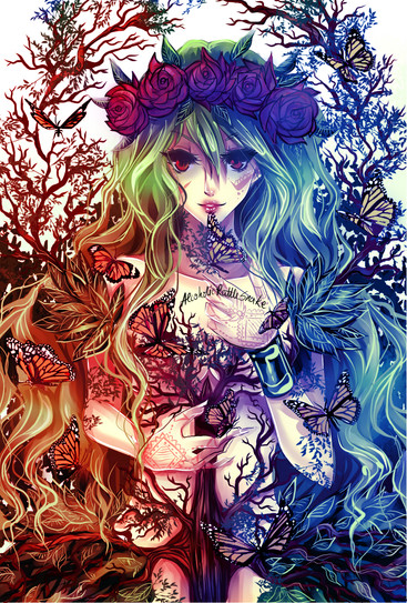 This piece is phenomenal... the stylized and expressive colouring and shading really works well with this concept, and I especially like the way which you blended the colours of her skin~ You have exceptional skill, and I can't wait to seeing some more of your work! (I just had to watch you!)