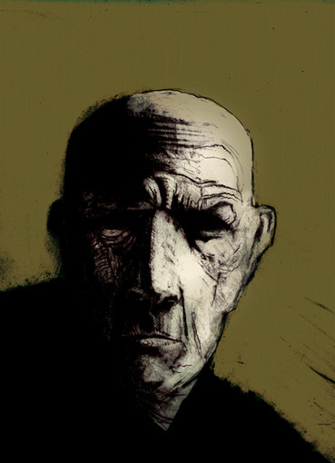 The stick-like knobs on the sides of his head along with the scratchy texture of his face make me think of a piano or harp perhaps: the texture of his face are actually strings ties to the knobs on the sides, like some form of nightmarish torture. Very spooky!