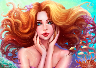 Beautiful! The the hair is my favourite part, the different shades of red and the mainly blue background make it stand out. The flower pins are a nice way to tie the dress and hair/background together, while still making it stand out. The background and her dress add a mystical theme to the piece that I also like.