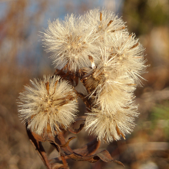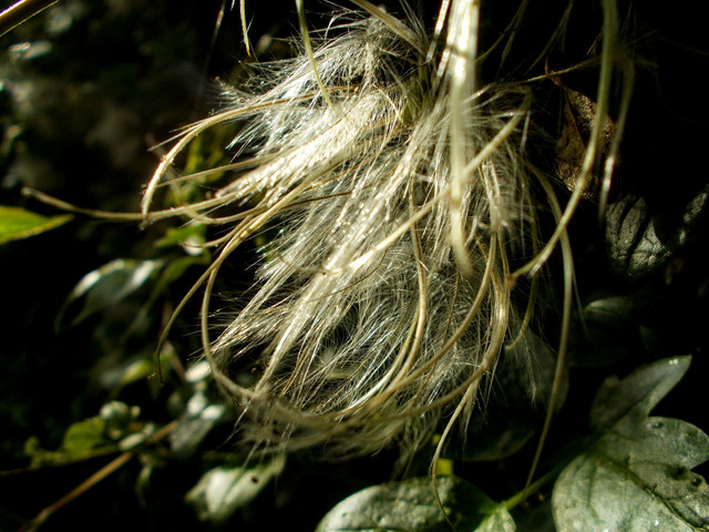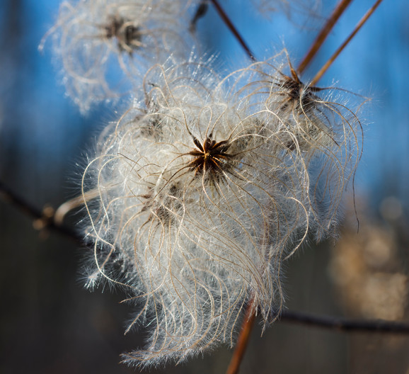 Clematis vitalba seeds in autumn, fluffy heart-shaped.Graines de clématite des haies en automne, en forme de cœur duveteux.