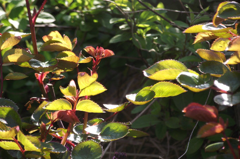 Young leaves of a Japanese spiraea in springtime.Jeunes feuilles d'une spirée du Japon au printemps.