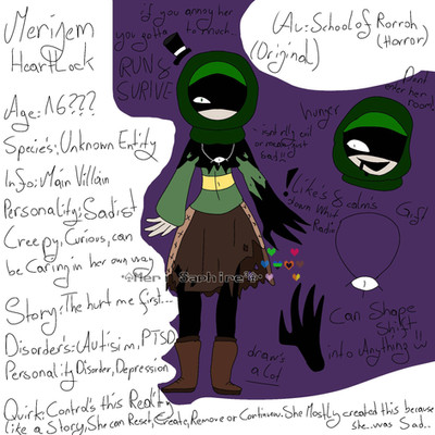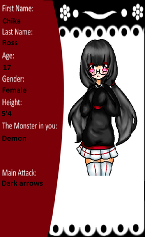 Bio: Vicky was born deep in the woods. She don't remember having any family. Even as a child Vicky was all alone. People who came into the forest never wanted to go near her. They feared Vicky for how she look and how tall she was. She started to grow angrier each day that went by because people started to try to attack her. She was still child so she ran away when people attacked her. Hiding in the trees. She didn't have any friends. She started to study about science everyday by stealing books. She loved Science very much because it was only thing that interest her. She couldn't even tell the people she meant no harm because her mound was closed shut. If she ripped out her mouth to speak. People just scream and ran away when they heard her screeching. She couldn't speak words. Only screeching a high pitch sound that made many pass out. Her large sharp teeth striking terror into many people's hearts. Years passed by of Vicky being alone. Until one day she found her familiar. A small blind baby girl thrown into the forest. Vicky was surprised that the baby didn't fear her. Vicky name her familiar Hope because the baby was the only hope Vicky had to feel loved. Vicky loved hope so much if anyone took Hope. Vicky wouldn't let out a blood chilling screech before attacking. Vicky made a hope for the both of them. Years passed Hope and Vicky growing a bond so strong that hope could know just what her mother wanted to say. Even if Vicky couldn't speak Hope just knew. Vicky and hope learn more and more about science. People kept coming in the forest to attack the small family. It wasn't a good place to raise the now five year old Hope. Vicky heard about a island of half breed looking for teacher. Since Vicky knew science inside and out now. She decide she would work there will hope as her voice. Hoping that they could have a good home there.