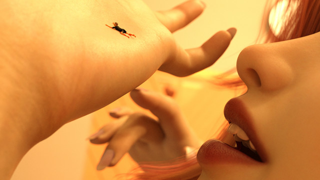 The poor bug sized guy might be very scared as she let slip him down from her figertip.I can imagine how is she laughing looking at this guy being so insignificant small even compared to her pinky