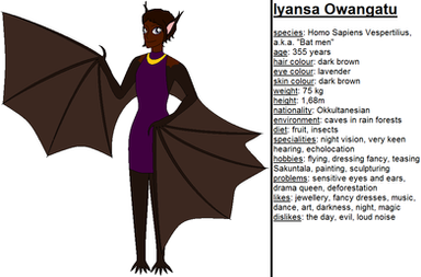 AWRIGHT! ANOTHER ONE!This one was conceived by ! Also, the design for the female is based off of one of 's own characters, Cvetka Novak. I don't think the design is QUITE accurate, but hey. It's a female Batling! XD