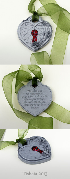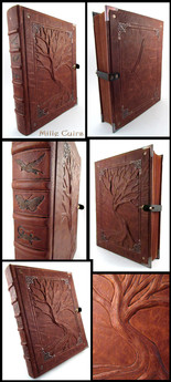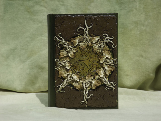 This journal is the most complicated piece I ever made, and certainly the one that took me the longest, but I really love how heavy and solid it turned out. The raspberry bush is woven around the center triskelion and reaches out to the back of the book. I hope the combination of metal-looking corners and triskelion, the soft flowing quality of wood, the sweet berries and the sharp thorns can inspire the future owner. Perfect for writing fanfiction ;D.The journal is based on custom made 300 pages blank book. It's 14,5 x 11 cm and 3,5 cm thick - without the clay cover. The cover itself is made out of precolored metallic polymer clay and 28 olivine Swarovski zirconias. Everything made by hand, starting from the wood boards through the silver polymer clay details, leaves, branches and thorns, and ending on the raspberries. The polymer clay parts are painted with matt protective varnish.