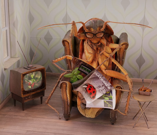What do cockroaches do when they want to relax and wind down? Eating a nice dinner, watching tv and reading an interesting article in their favorite magazine! They’re not unlike us humans after all.This 3D project is based on an Inktober 2017 drawing. The cockroach and a few other items are 3D scans of real objects. I have started to upload the 3D assets on sketchfab, head over there if you want to explore in full 3D:
