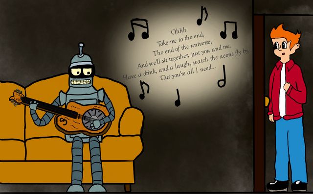 I tried to copy Matt Groening's art style on both of the characters, just because of the setting. I also thought the "losing a bet" thing fitted perfectly for Bender.