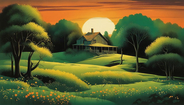 #ai #dreamup #digitalart #wallpaper #landscapepainting #cartoon #digitalpainting #forest #architecture #cabin #forgotten #homestead #illustration #illustrationfantasy #ozark #springtime #sunset #illlustrationart #ai_art