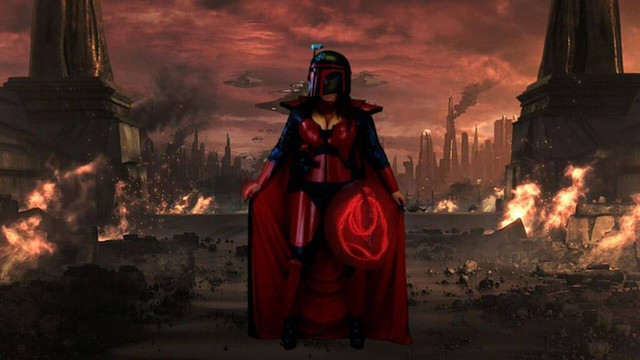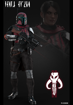 A seasoned Mandalorian woman with custom armor.